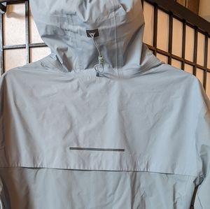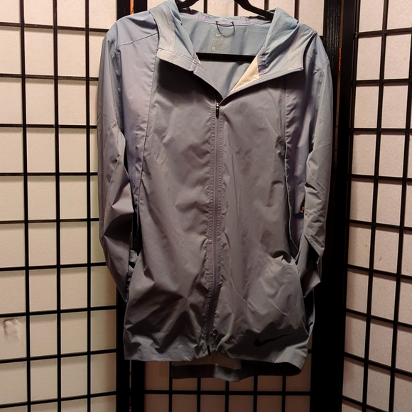Slate gray hooded Nike Runners Jacket - Zonal Shield. Like new- no wear no tear. Large true to size. Rubber dipped coated Dule front way Zipper. 4 up-zip front pockets, 2 shallow breast pockets and 2 deep hip pockets. Adjustable Velcro wrests, back vent flap, Designed for fashion fitness and function. This garment features Nike aeroshield technology, which utilizes a wind and waterproof membrane spun from ultra thin nanofibers. nanofibers. The result is a new waterproof layer that is both lighter and more breathable than any Nike comment before it. welcome to the future of waterproof breathable technology. Raincoat. Windbreaker. Hoodie. Zip front.