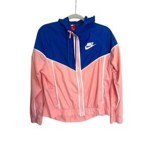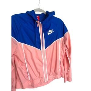 Nike Jacket Bleached Coral Pink Blue Full Zip Womens Size M Hooded Windbreaker