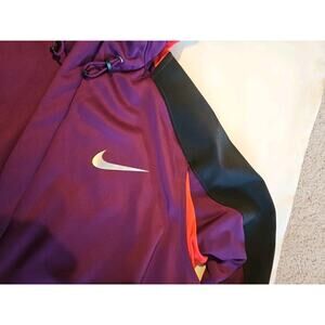 {The Nike Jacket is a large purple hyper elite Therma-Fit athletic zip-up hooded active jacket made of polyester with a blended fabric type. It is designed for travel, activewear, and casual occasions with a zip closure and long sleeves. The jacket features a hood for added protection and is part of the Nike Therma product line, making it a high-quality and stylish addition to any man's wardrobe. Machine washable and in a size regular, this Jacket offers comfort and functionality for the active man on the go.