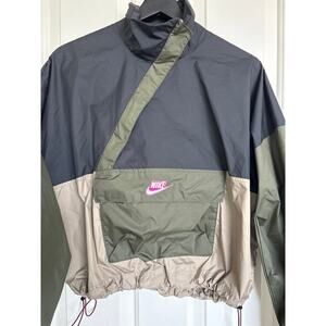 Stylish and functional outerwear piece, a Nike pullover windbreaker jacket designed for women. This jacket features a unique color-blocked design with olive green sleeves, a black upper body, and a beige lower section, creating a visually appealing contrast. The front showcases a convenient flap pocket with a pink Nike logo, adding a pop of color and brand recognition. The jacket also includes a partial zip-up front, elastic cuffs, and a distinctive pink swirl logo on one sleeve, enhancing its sporty and modern aesthetic.