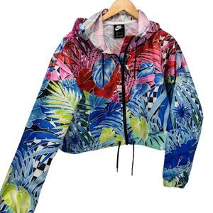 Nike Jacket Womens Medium Cropped Hooded Full Zip Lightweight Windrunner Floral Lightweight Tropical Boxy Fit Coastal