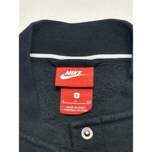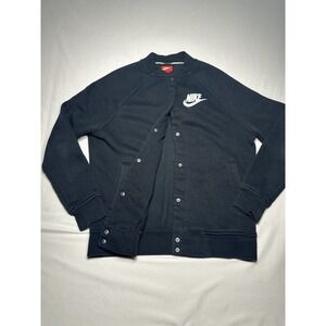 The Nike Jersey Bomber Jacket in black, size small, is a stylish and practical choice for men who enjoy sports activities like walking and basketball. Made of comfortable cotton fabric with a jersey style, this jacket combines functionality with a sporty theme. The bomber jacket design adds a trendy touch to the classic black color, making it a versatile outerwear option for various casual occasions. Perfect for layering in cooler weather, this Nike jacket is sure to be a favorite in any man's wardrobe.