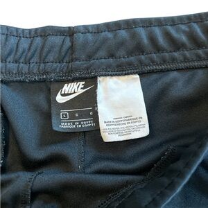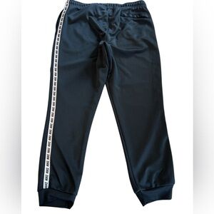 These are men’s Nike joggers the repeat tape style with Nike written down both sides. They have pockets on both sides in the front and a snap pocket in the back. They feature in elastic waist with drawstring and jogger hems.