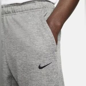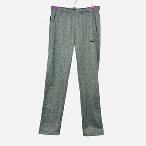 The product is a pair of Nike Joggers for men in size S, featuring a Heather gray color and made of 100% polyester fleece material. These sweatpants have a pull-on closure, elastic waist, and pockets for convenience. With a regular fit and straight leg style, they are suitable for activewear occasions such as gym training, cross-training, and running. Machine washable and part of the Nike Therma product line, these joggers provide comfort and warmth for winter, fall, and spring seasons.