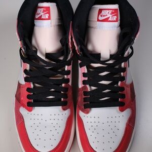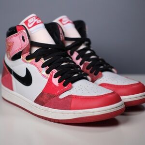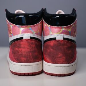 Like new Jordan 1 High "Next Chapter" sneakers as seen on Miles Morales in "Spider-Man: Across the Spider-Verse". This fresh take on the iconic Chicago colourway boasts a mix of materials, including lustrous leather and soft suede. No box. Worn once.