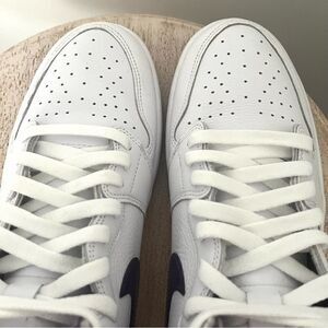 The upper displays a crisp white tumbled leather base with a contrasting Court Purple leather Swoosh on both sides