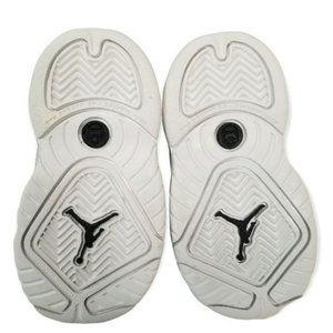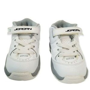 Jordan B’Loyal in white and metallic silver colorway. The shoes feature the Jordan Jumpman logo at the heel and on the sole. Jordan is embroidered on the hook and loop closure. Jordan’s number 23 is on the toe box and heel. Preowned and in great condition.