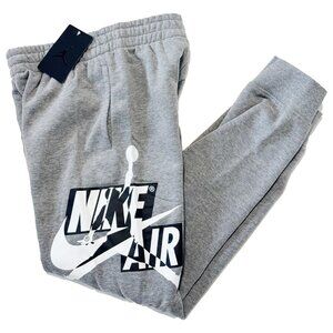 Authentic Nike Jordan Boys Joggers in the “Carbon Heather” gray colorway (Style Code: 95A434-GEH). Features the bold Nike Air x Jumpman logo graphic across the leg for that classic streetwear look.