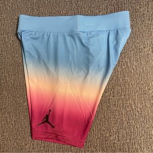 NWT. Jordan Jumpman Biker Shorts in a size medium (10-12 YRS). Color is listed as Hyper Violet. They are really multi-colored with blues, pinks, and violet. Jumpman logo in black on front leg. Pull on style with elastic waistband. No drawstrings or pockets. Fabric is 95% polyester and 5% elastane. Please note that there are slight indentation marks on the waistband from the hanger. Please see photos for measurements.