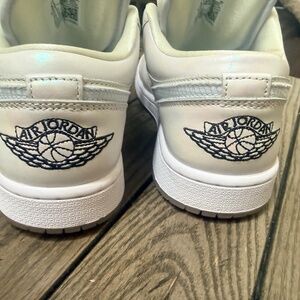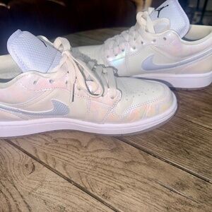 Only work once! These shoes are mostly white with a very light baby blue Nike swoosh and a pinkish opalescent sheen. They are super adorable but didn’t fit me well and I can’t take them back at this point (had them sitting in the box too long).