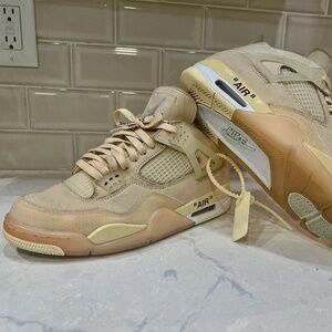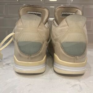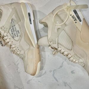 The Nike Air Jordan 4 Retro Off-White “Sail” is a collaboration between Nike and Off-White, designed by Virgil Abloh. This sneaker features a soft “Sail” colorway, which is an off-white cream shade that extends across the entire shoe, including the leather upper, mesh accents, and the translucent wings. The design also includes signature Off-White text on the medial side, zip-tie, and “AIR” branding on the midsole. This model blends the classic Jordan 4 silhouette with modern, deconstructed aesthetics.