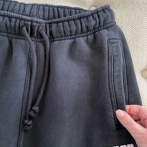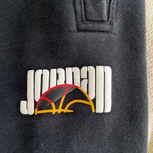 Nike, Jordan Jumpman, DNA sport fleece jogger, sweatpants with Jumpman logo at one hip and Jordan basketball logo at the other hip. Paper Jordan Jumpman tag on the single back welt pocket. Hip pockets. Minor fading, and a small pinhole on the side of the Jumpman. Laying flat measures 28 inch inseam with a 13 inch rise and 13 inches straight across the waist when relaxed stretching to 17 inches without much resistance. Tag size small. Cotton and polyester blend.
