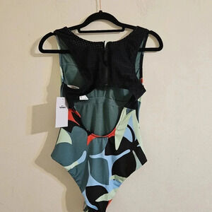 Body: 83% recycled polyester/17% spandex. Mesh: 82% nylon/18% spandex. Mesh Lining: 84% recycled nylon 16% spandex (chlorine resistant).