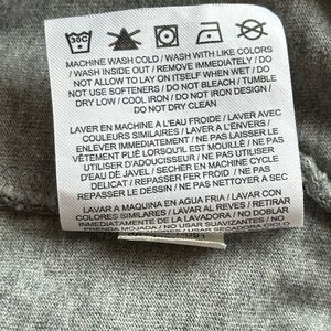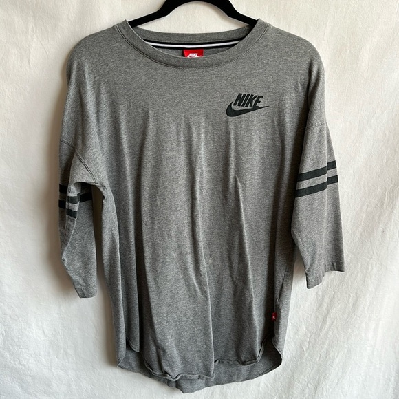 Nike Just Do It gray, black, and red top, size M. Generally good preowned condition; a few spots (last photos) that mostly blend into the gray/white 100% cotton heather fabric; may come out with treatment. Drop shoulder mid-length sleeves. High-low. Two stripes on each sleeve.