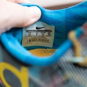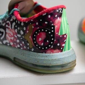 These Nike KD 6 "What The" Kevin Durant Sneakers are a Men's Size 10. They are in good preowned condition with some signs of general wear likes knicks and scuffs. These shoes are so wild, I'm honestly not sure what is supposed to be there and what's not! LOL So please review the pictures closely. These shoes will be sold as-is and may not be returned because they are used. Please expect some imperfections. Such fun and wild style!!