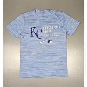The product is a Nike Kansas City Royals T-Shirt for men in size small. It is a blue heather color with a short sleeve design and made with Dri-Fit material for moisture-wicking comfort. This shirt is an official fan apparel for the Major League Baseball team, the Kansas City Royals, making it a stylish and functional choice for any baseball fan looking to support their favorite team in style.