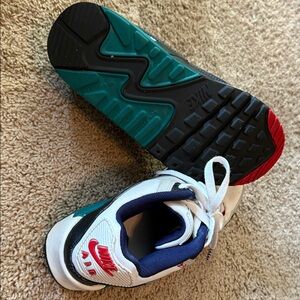 Vibrant Nike sneakers for kids. Features white, red, and teal accents. Comfortable and stylish for everyday wear.