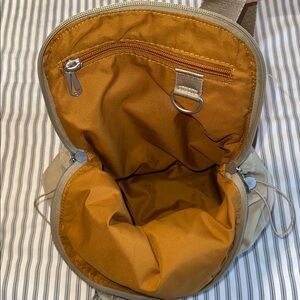 Compact Nike backpack in khaki. Features chain accents and a front pocket.