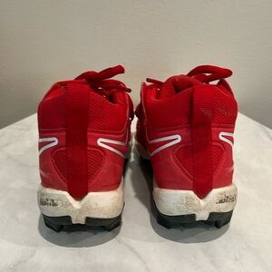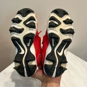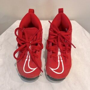 These Nike Cleats boast a vibrant red color with a bold white swoosh, perfect for making a statement. Designed with a chunky, aggressive sole and rugged traction patterns, they offer excellent support and grip for various terrains. The lace-up closure ensures a secure fit. Great condition