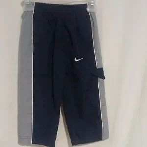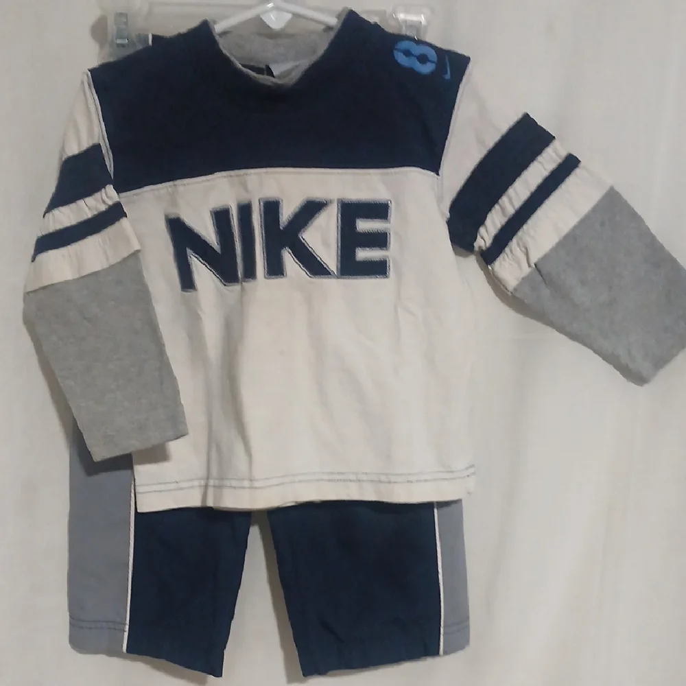 Comfortable Nike long sleeve tee for kids. Features blue and gray design. matching pants. Ideal for casual wear.