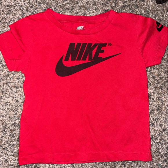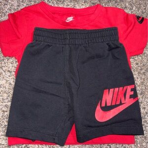 Vibrant red Nike tee with bold logo, matching jogging pants style shorts- Ideal for active kids.