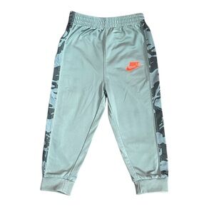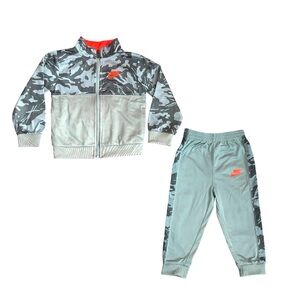 Stylish Nike kids tracksuit featuring a camo pattern. Gray with vibrant orange accents. Perfect for active days.