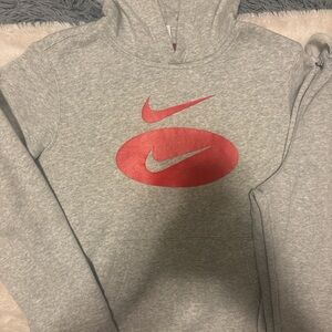Cozy gray sweatpants set with bold red Nike logo. Ideal for play and relaxation.
