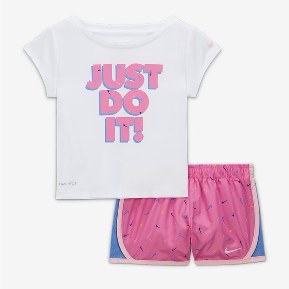 White t-shirt with bold pink 'Just Do It' print. Pink shorts with colorful accents. Comfortable and stylish.