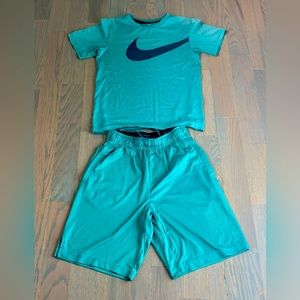 Nike kids jersey set with bold red and blue design. Features team logo and number 10. Ideal for young soccer enthusiasts. This is in play condition, back has some spots that peeled but can still wear. Fits like a size youth small.