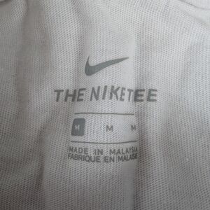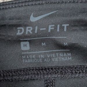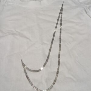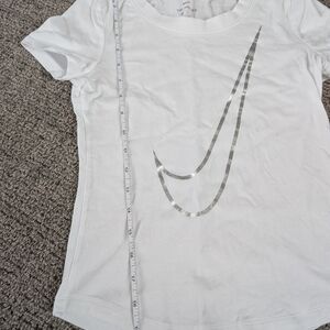 Nike kids' outfit set. Includes white t-shirt featuring a silver swoosh design and black cropped leggings with white swoosh. Size M.