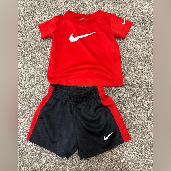 Vibrant red Nike tee with black shorts. Ideal for playtime.