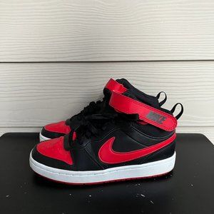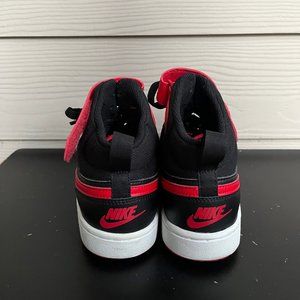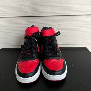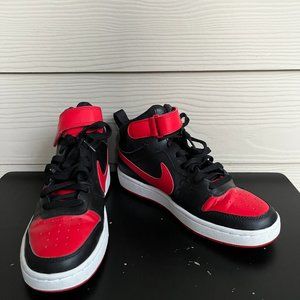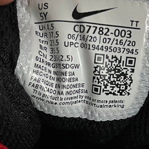 Stylish Nike sneakers for kids. Black base with vibrant red accents. Comfortable and durable design. Worn very little by my son, only for a few special occasions, so they are still in great shape.