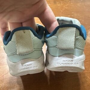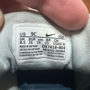 Comfortable Nike sneakers for kids. Durable design in blue and gray. Perfect for play and sports. No rips or tears. In good condition. They are a bit dirty. Size 9c.