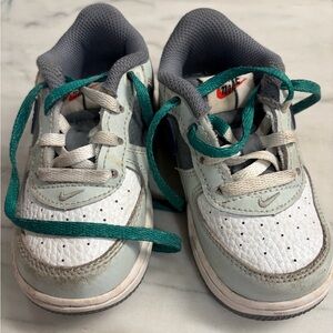 Baby Nike Air Force Ones in used condition with some superficial dirt but very little actual wear! Classic white, blue and green colors. Perfect for everyday wear.