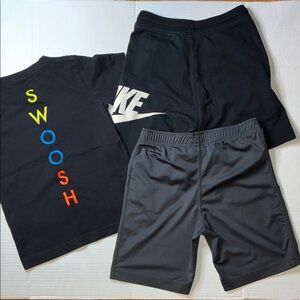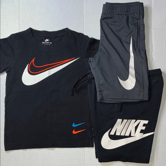 Nike shorts set for kids. Features bold logo design. Includes tee with black and gray shorts. 3pcs Tee 4/5 - Gray Shorts 5 - Black Shorts 5/6