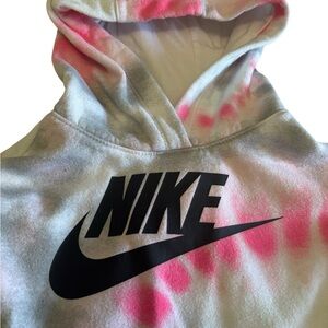 Stylish Nike hoodie with a pink, gray, and white tie-dye pattern. Perfect for casual wear.