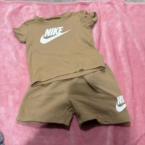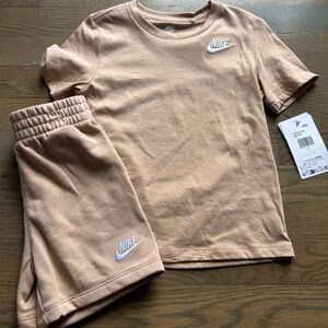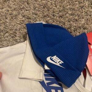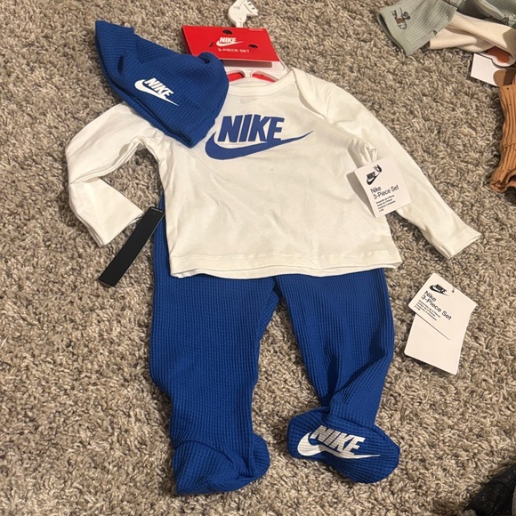 Stylish Nike set with a white top and blue pants. Includes matching hat. Ideal for active kids.