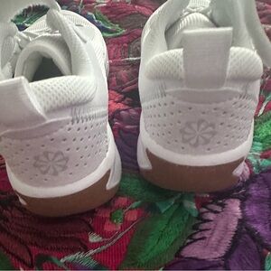 Stylish white sneakers with tan sole. Secure strap closure. Perfect for active play.
