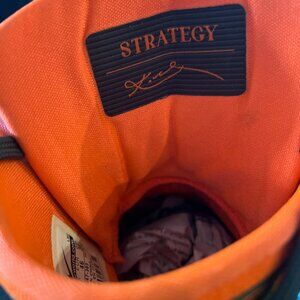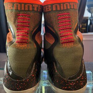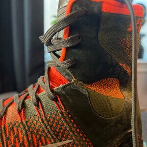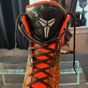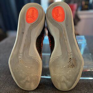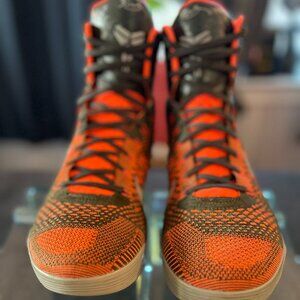 The Nike Kobe 9 IX Elite "Strategy Sequoia" sneakers are a limited-edition pair designed for men in size 12. Released in 2014, these high-top sneakers feature a lace-up closure and a vibrant orange colorblock pattern, exuding a stylish and fashionable vibe. The shoes are crafted with FlyKnit material for the upper, and they boast cushioned arch support for comfort. With a rubber outsole and a signature Kobe 9 Elite theme, these athletic shoes are suitable for various activities like basketball, walking, and dancing, making them a versatile and stylish choice for casual wear.