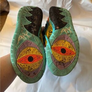Eye-catching teal high-top sneakers with bold orange and leopard print accents. Perfect for making a statement.