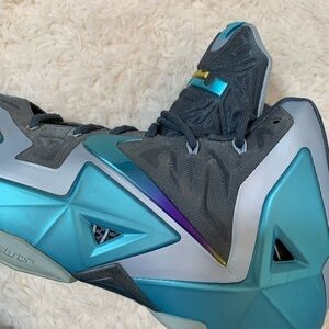 These are an amazing pair of sneakers if you are a collector!! They are in amazing condition. They go for a pretty penny on other websites!! Brand: Lebron 11 Gamma Blue Condition: Preloved But Excellent!!!!!!! Size: 13 MENS Color: Blue/Silver/ Gray PLEASE REFER TO ALL THE PHOTOS!!! NO TRY ONS 🛑. THANKS 💜.