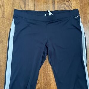 These are ladies Nike track/leisure/workout pants. They are navy with a white stripe down the side of each leg, an embroidered Nike check at the hip, inside drawstring at the front and they are 100% polyester. The pants are a size XL, 16-18. There is a small mark on the lower part of one leg on the white stripe, see photo.