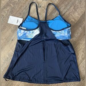 This listing is for a NWT's Nike Women's Tie Dye Layered Tankini Top, in size medium, in color blue.