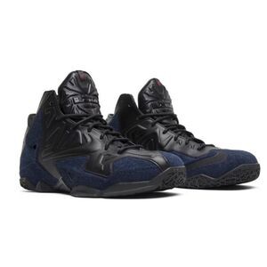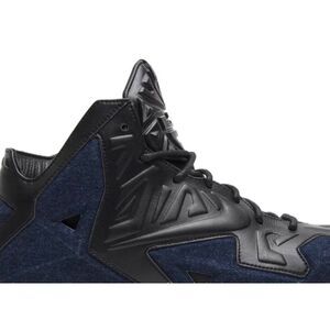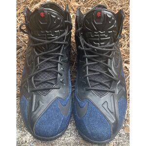 Nike LeBron 11 EXT Blue Denim Black Leather Sneakers Size 13/Excellent preowned condition. The limited edition Nike LeBron XI EXT "Denim" is an off-court version of LeBron's technical on-court model. They feature a premium blend of black leather and blue denim on the upper, Armorposite overlays, waxed laces, leather lining, and a rubber outsole. This impressive lifestyle sneaker also has personal touches, including LeBron's logo on the tongue and signature on the midfoot plate.