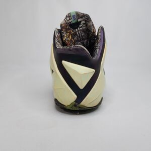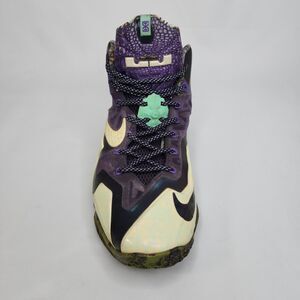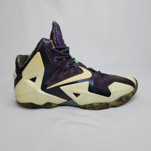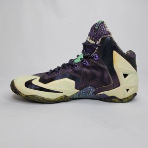 The Nike LeBron 11 "Gator King" (All-Star edition) features a Cashmere, Green Glow, and Purple Dynasty colorway. This pair is a Men's US Size 9.5 and was manufactured in 2013 under the style code 647780-735. The design incorporates Hyperposite construction and Flywire technology.