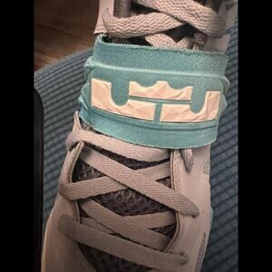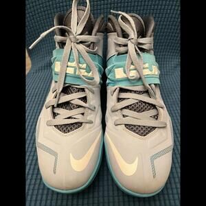 Authentic Nike LeBron 12 sneakers in Men’s size 9, style code 639686-402. Features a teal, gray, and white colorway with signature LeBron midfoot strap, mesh upper, and Zoom Air cushioning pods for responsive comfort. Pre-owned in very good condition with light signs of wear. No original box included. Discontinued and hard-to-find colorway.