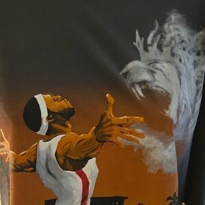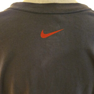 This Nike LeBron James black short sleeve tee showcases a striking graphic design, featuring a silhouette figure against a vibrant orange background. The artistic contrast between the dark fabric and the vivid design makes it a standout piece for casual wear.