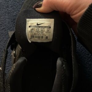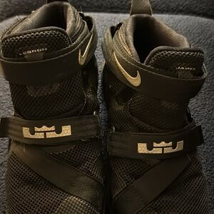 LeBron Soldier 9 Black & Silver basketball shoes by Nike. Features a sleek design with prominent branding. Good condition. Size 6Y