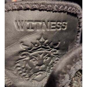 Features: Low-top basketball design with textured knit upper, patent toe cap, white midsole and red rubber outsole, embossed WITNESS tongue with lion crest.