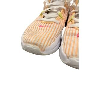 The Nike LeBron Witness VI 'Melon Tint' in White Lemon Twist is a men's athletic sneaker in size 8.5. Released in 2021, this Nike LeBron model features a white mesh upper with accents of Persian Violet, Yellow Strike, and Black. The sneaker belongs to the Nike LeBron product line and carries the nickname 'White Melon Tint'. Ideal for sports and casual wear, this stylish and colorful sneaker offers both comfort and performance for the wearer. Small imperfections *shown in pictures